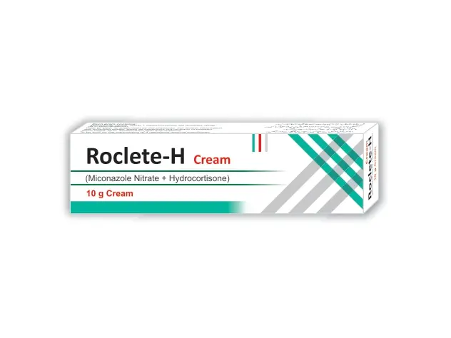 Roclete-H Cream is a combination topical medication by Caliph Pharma that delivers Miconazole Nitrate, a broad-spectrum antifungal, together with Hydrocortisone Acetate, a mild corticosteroid. It is designed to treat inflammatory fungal skin infections (e.g., tinea with itching, erythema) in Pakistan, offering both antifungal and anti-inflammatory benefits in a single application.